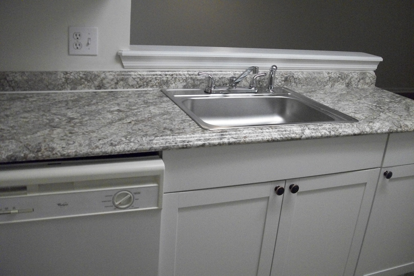 •Kitchen offers white appliances, dishwasher, garbage disposal, and white cabinets
